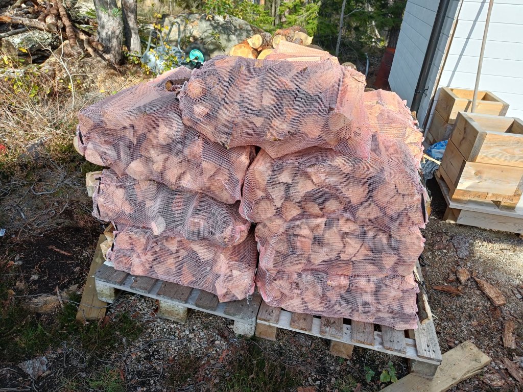 Ble 20 sekker til denne helga. Så da blir det 58 totalt. Fortsatt mye tømmer igjen.