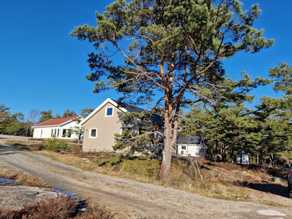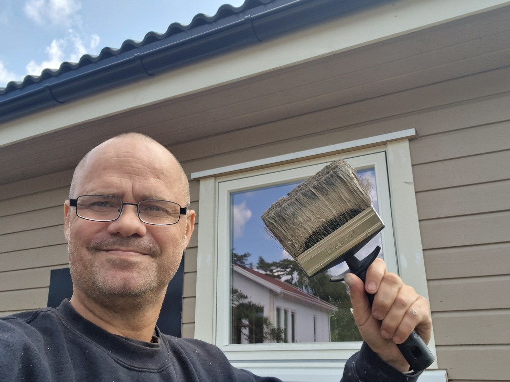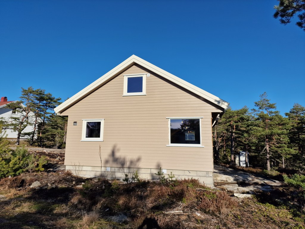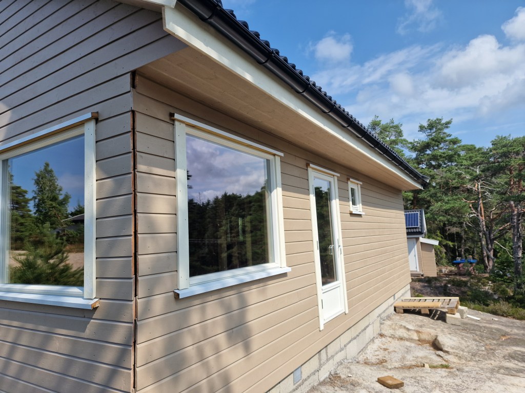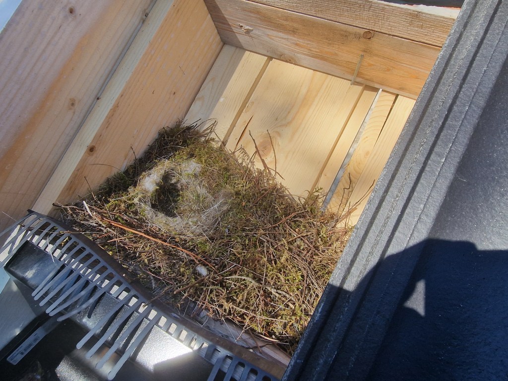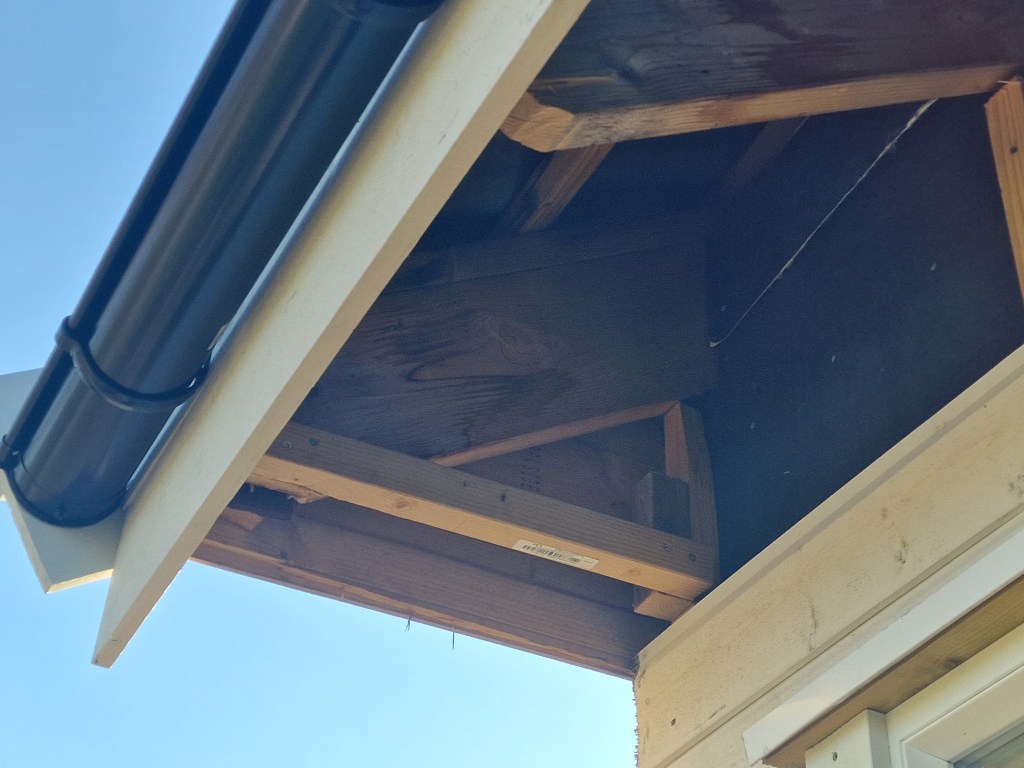 Har hatt noen utfordringer med å gjøre ferdig takutstikket på østsiden da kjøttmeis har unger oppunder taket. Så da kan jeg jo ikke tette der.