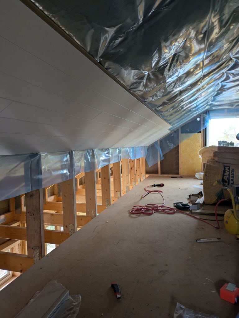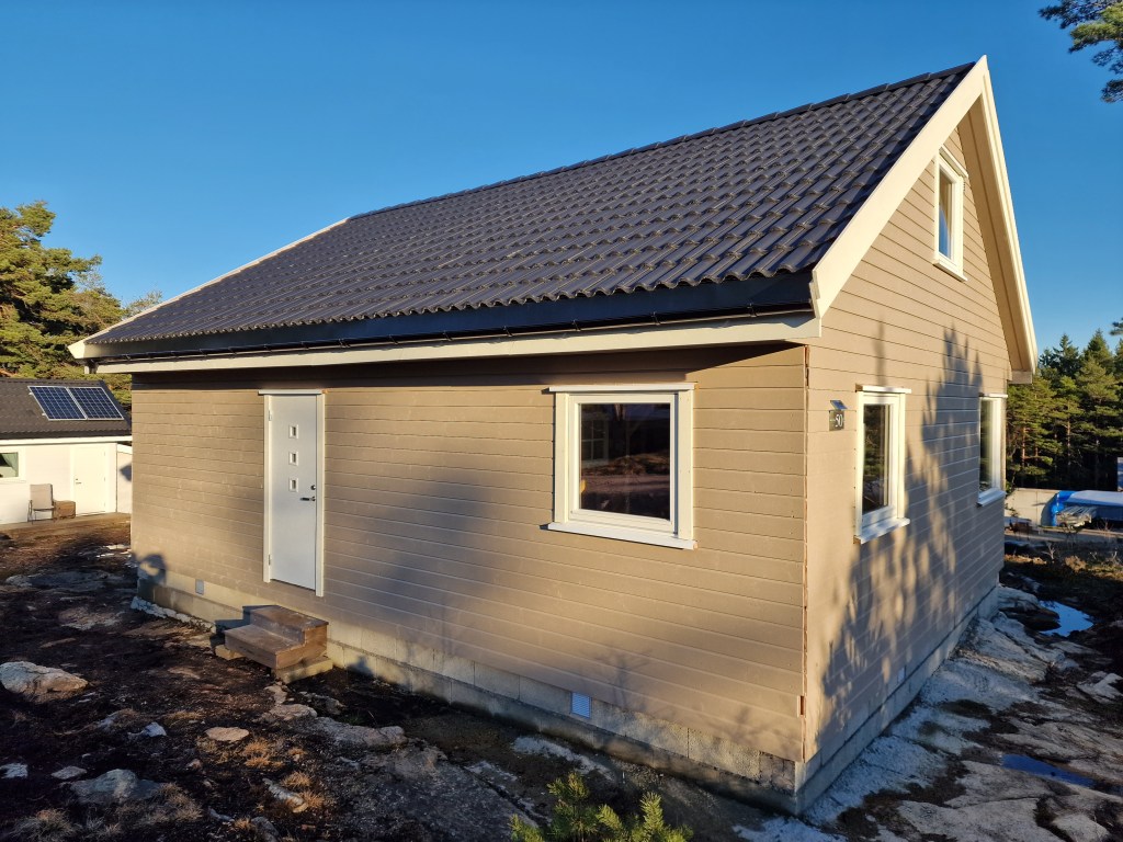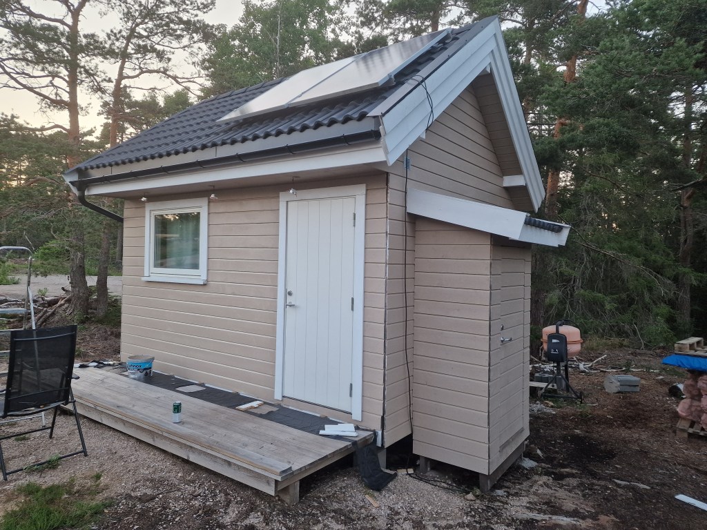 Og det er jo fortsatt mye igjen å gjøre her. Fikk kjøpt inn takpanel på byggmax som jeg har planlagt å ha på hemsen.