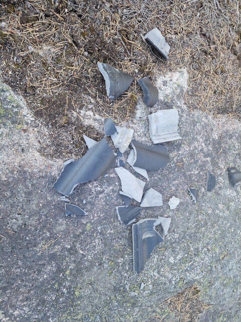 Dette er på sydøst siden, så jeg startet fredagen med å tette litt på nordøst siden. Fikk satt opp en plate, og tok ekspressen ned fra stigen med en takstein i hånda.