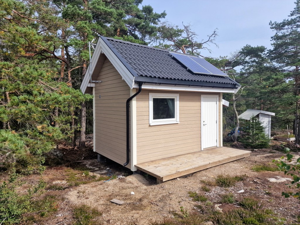 Det var jo noen kjøttmeis som hadde laget seg en bolig i hytta. Så måtte vente litt før jeg fikk tettet på østsiden. Men nå er det gjort, og det ser straks mye bedre ut.