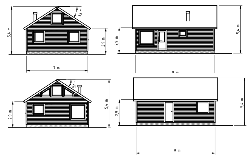 Tegningene begynner å ta form. Ser ut som om det blir 33 graders takvinkel. Så nå er annekset tegnet om med dør og vindu på sørsiden, og med riktig takvinkel. I og med at dør nå er på langsiden, så måtte jeg øke litt på høyden for at døren ikke skulle slå i taket.
