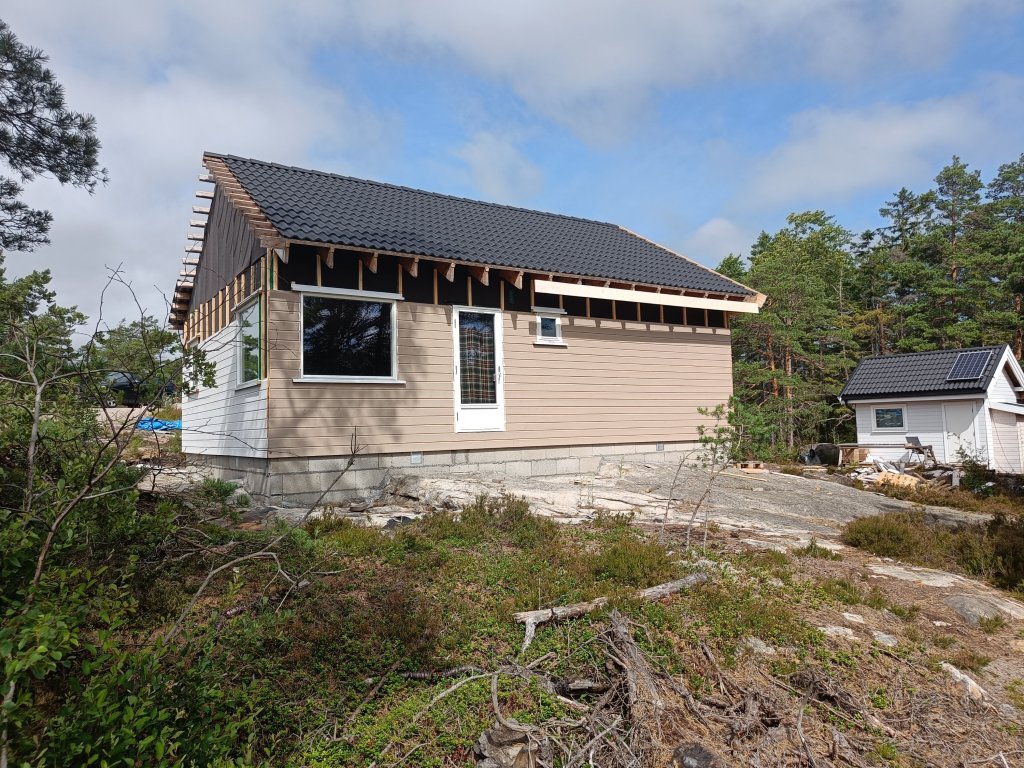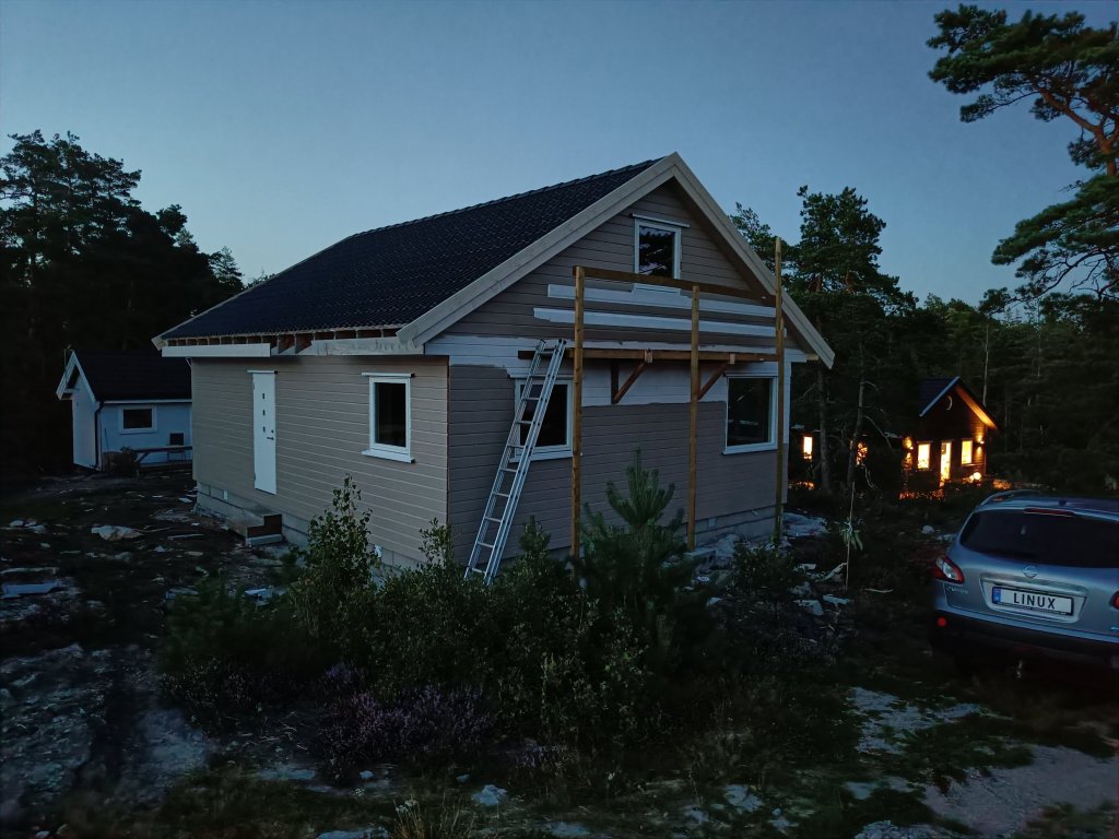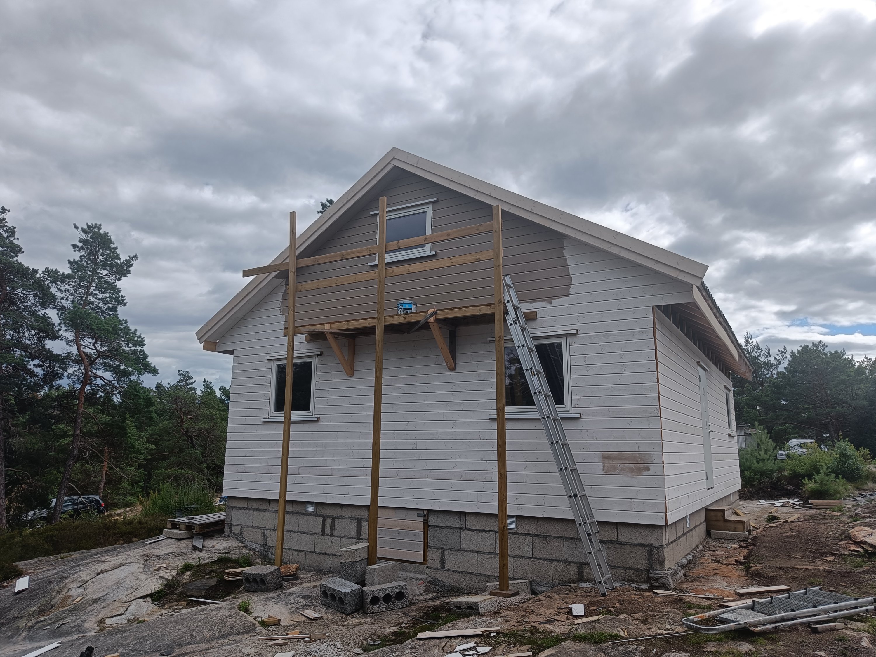 Litt bygging ble det også. Fikk satt opp litt ytterpanel, satt opp stillaset, montert noen utforingslekter samt satt inn det siste vinduet. Vilde malte litt på østveggen.